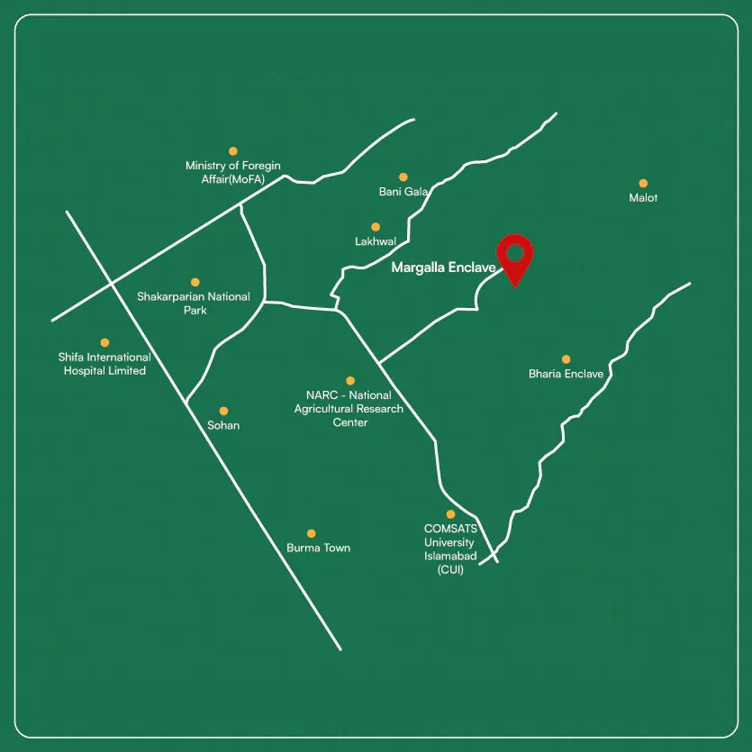 Margalla Enclave Islamabad is in the capital’s prime location, in CDA Zone IV, along Jinnah Avenue. Its lush green and serene landscape make it even more stunning.